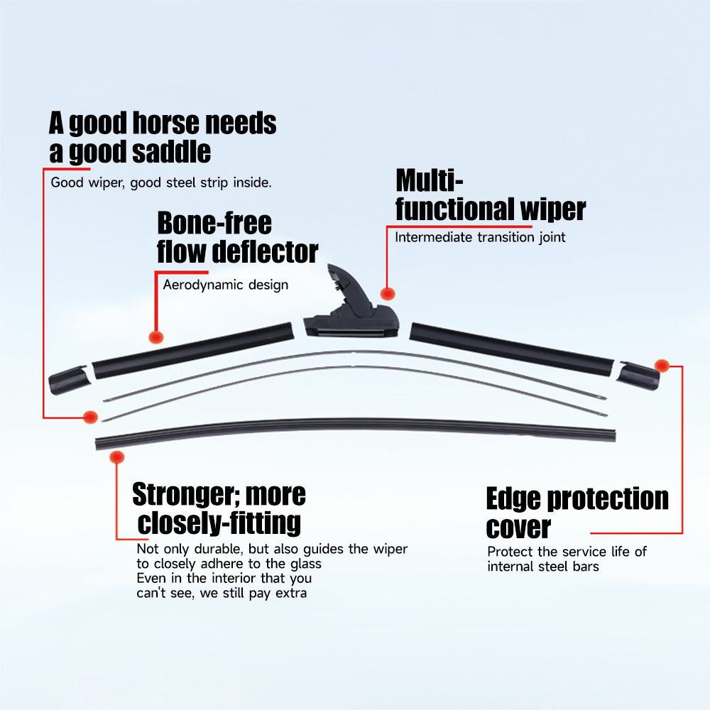 Drive with confidence in any weather with our high-quality car wiper blades. Designed with precision and durability in mind, these frameless wiper blades are constructed using premium rubber, sturdy steel, and durable plastic. They ensure optimal wiping performance for clear visibility during rain, snow, or other challenging conditions.
