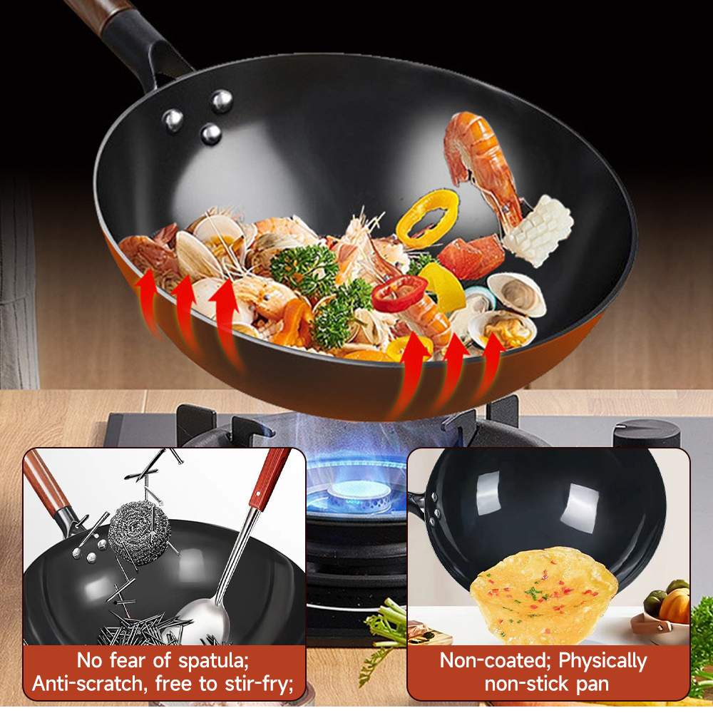 E-commerce Bestselling Nitrided Iron Wok, Rust-Resistant Traditional Iron Wok, Household Non-Stick Wok, No Seasoning Required, Stir-Fry Pan