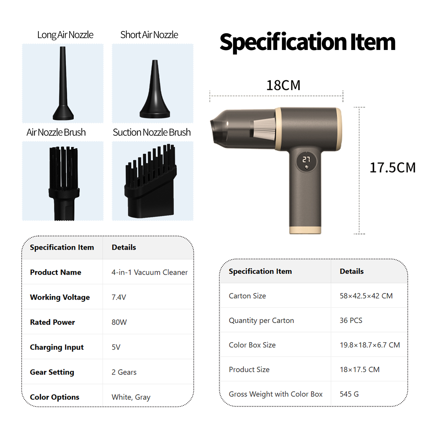 Portable 4-in-1 Vacuum Cleaner (Blowing, Suction, Pumping, and Charging) – Cordless Handheld Car and Home Vacuum Cleaner